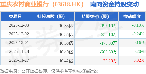 股票配资平台代理招商 重庆农村商业银行(03618.HK):12月3日南向资金减持197.1万股